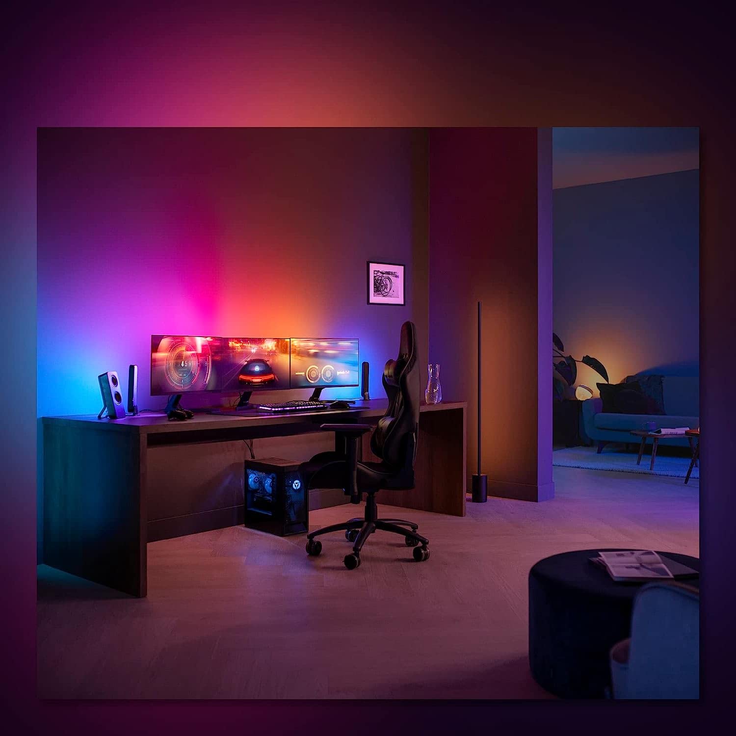 - La tira de luces LED Hue Play gradient lightstrip para PC está disponible en tres tamaños para configuraciones un único monitor y tres monitores e incluye clips de montaje, lo que facilita la conexión a la parte posterior del monitor.